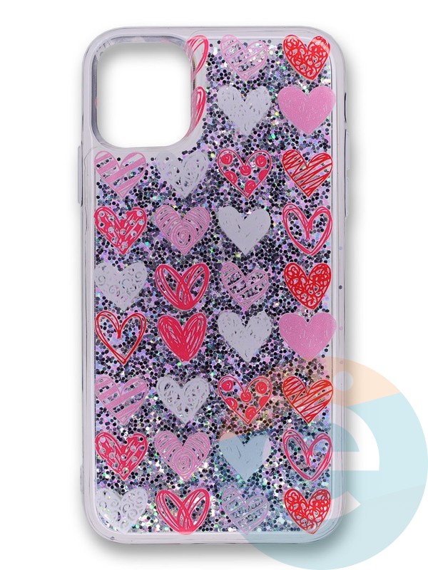Накладка силиконовая Переливашка с жидкими блёстками на Apple iPhone 11 Pro розовые сердечки