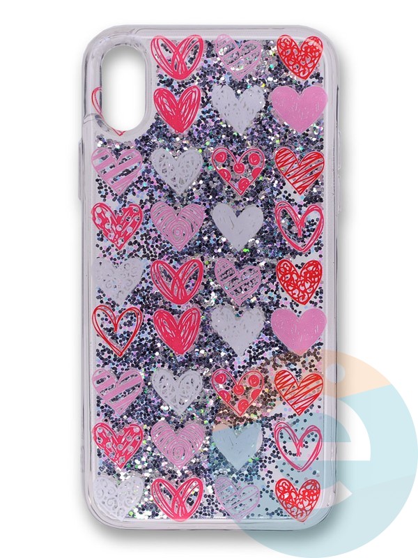 Накладка силиконовая Переливашка с жидкими блёстками на Apple iPhone X/Xs розовые сердечки